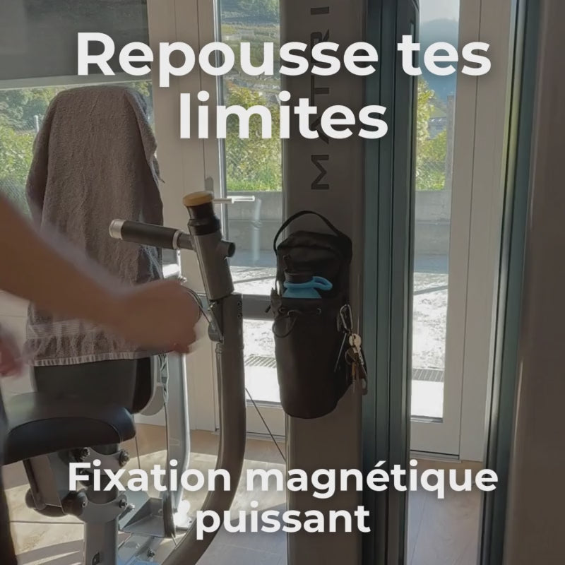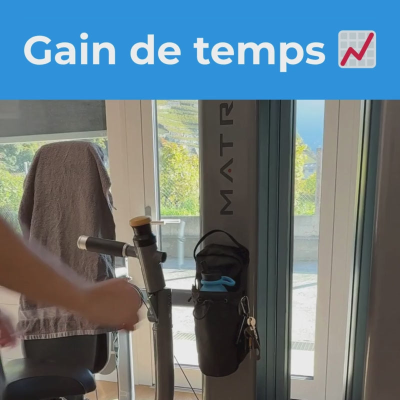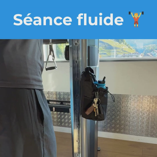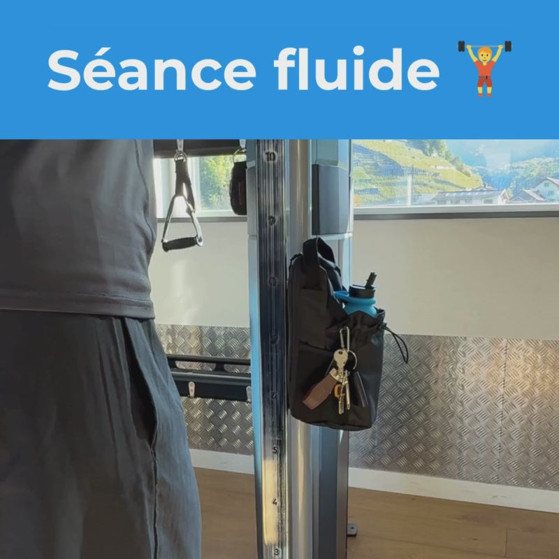Conçue pour la salle : se fixe aux machines, garde gourde, téléphone et clés rassemblés à portée de main. Plus d’affaires au sol, plus d’allers-retours au casier, séance plus fluide.